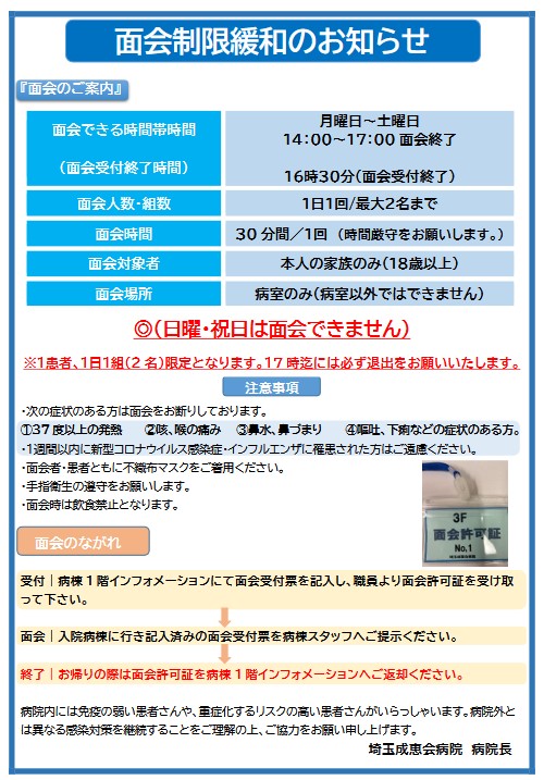 面会再開のお知らせ 平素より当院の運営にご理解とご協力を賜り、誠にありがとうございます。 感染症の拡大により面会を中止しておりましたが、2月16日(月曜日)より一部制限内ではありますが、再開致します。 面会中止期間中は、院内の感染対策のご理解とご協力、誠にありがとうございました。